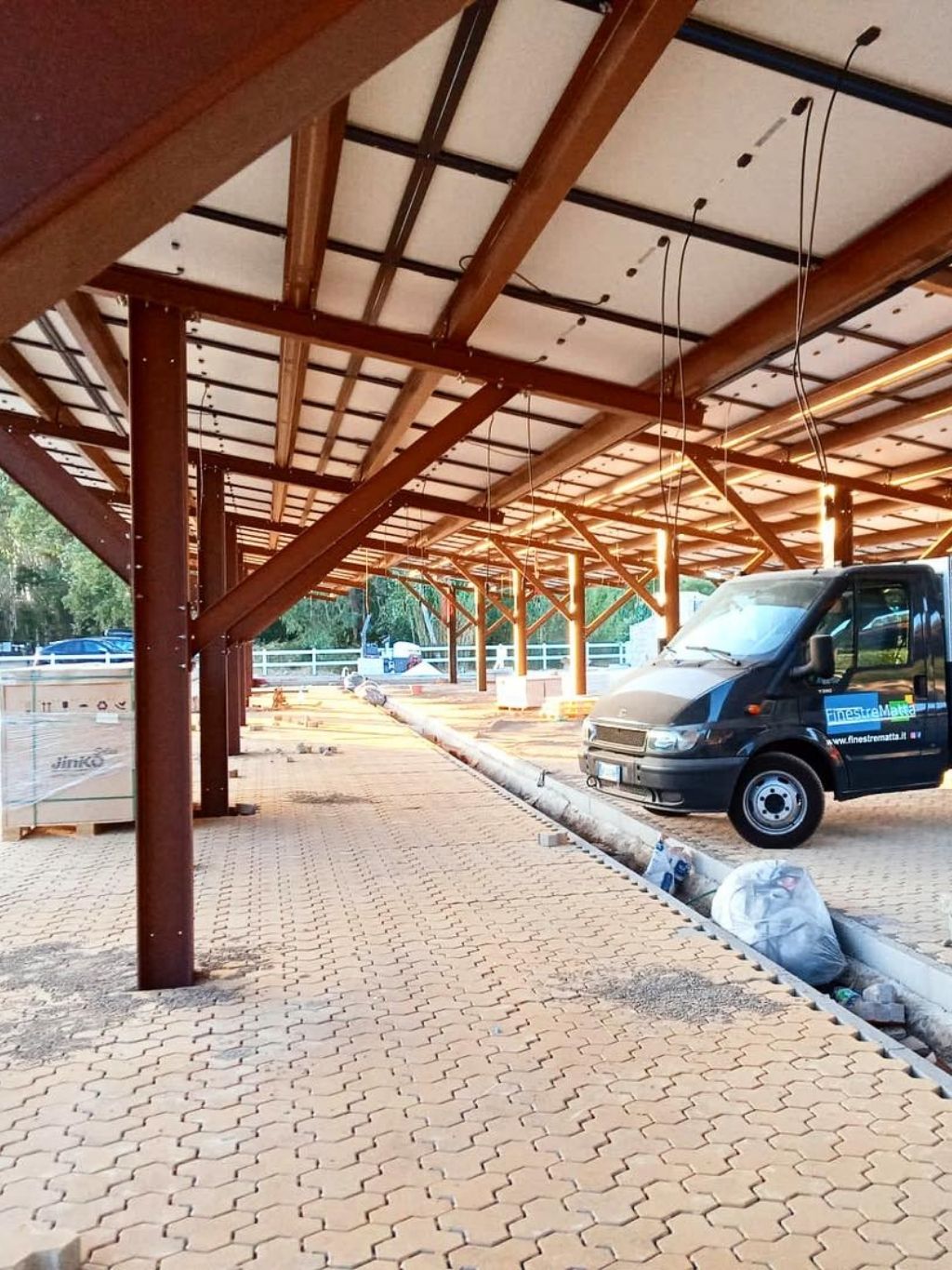 Tettoia in alluminio: struttura a sbalzo o con pilastri, copertura in pannelli sandwich o lamiera coibentata. Soluzione robusta per aree di servizio e parcheggi coperti.